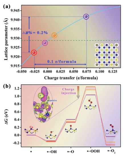 Similarly to hydroxide electrocatalysts, first-row transition metal oxides (especially of Ni, Co, and Fe) are the most popular metal oxide materials researched for oxygen evolution reaction in alkaline electrolytes. In particular, spinel- and perovskite-type oxide materials have been extensively studied [47,48,49,50,51,52,53]. For example, in Co3O4 the generation of oxygen vacancies enhances conductivity, and interactions with the support of or by doping with heteroatoms stabilizes Co4+ [54], which leads to the enhancement of electrocatalytic activity [42,43]. In general, stabilization of high oxidation states, as well as Fe4+ and Ni4+ in oxide matrices (spinel, perovskite), leads to better OER reactivity [42,55,56]. It has to be noted that the structural evolution taking place during electrochemical anodic reaction undergoes a remarkable structural transformation of the metal oxide catalysts under very high potential yields and results in the formation of the oxyhydroxide phase overlayer at the catalyst surface [57].