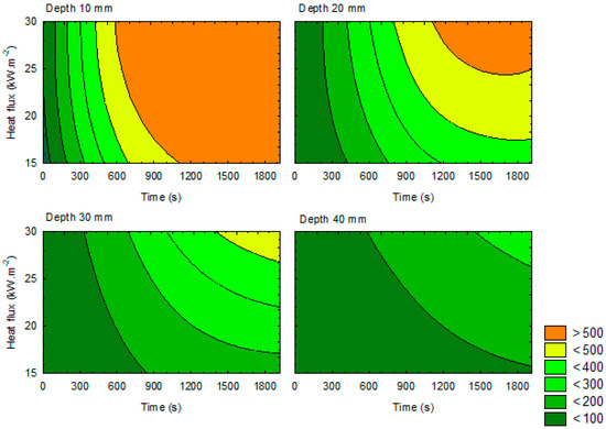 The marginal temperature needed to reach a charred layer is shown in light green. It is a temperature field reaching a temperature of 300 °C in the entire time interval (from 0 to 1920 s) of thermal loading with a ceramic infrared heater. The course of charred layer formation up to a depth of 10 mm under the surface is shown upper left. The rate and extend of charred layer formation clearly indicates the dependance on the heat flux and time of loading. At a heat flux of 15 kW·m−2, the charred layer starts to form in a time of 200 s from the beginning of the loading; at a heat flux of 20 kW·m−2, it forms in a time of 120 s; at a heat flux of 25 kW·m−2, it forms in a time of 100 s; and at a heat flux of 30 kW·m−2, it forms in a time of 95 s. Based on the measurement of temperature courses in test samples on thermocouple T1, different times of reaching the critical temperature of 300 °C were recorded. The measurements show that, for charred layer formation up to a thickness of 10 mm under the surface, the critical heat flux at a thermal load of 15 kW·m−2 occurs in 505 s, at a thermal load of 20 kW·m−2 occurs in 395 s, at a thermal load of 25 kW·m−2 occurs in 300 s, and at a thermal load of 30 kW·m−2 occurs in 315 s, i.e., in initiation phase of the fire. The course of the charred layer formation at a depth from 10 to 20 mm under the surface of test samples is shown in Figure 3 (upper right). The rate and extend of the charred layer formation also indicates the dependance on the heat flux and time of loading. At a heat flux of 15 kW·m−2, the charred layer starts to form in a time of 760 s from the beginning of loading, at a heat flux of 20 kW·m−2 in 550 s, at a heat flux of 25 kW·m−2 in 460 s, and at a heat flux of 30 kW·m−2 in 415 s. It means that, for the charred layer formation at a depth from 10 to 20 mm under the surface of the test sample, the critical heat flux is 30 kW·m−2, reached in a time of 415 s, i.e., in the third quarter of initiation phase of the fire (up to 600 s from the beginning of loading). The course of the charred layer formation at a depth from 20 to 30 mm under the surface of test samples is shown in Figure 3 (bottom left). The rate and extent of the charred layer formation indicate the dependance on the heat flux and time of loading. At a heat flux of 15 kW·m−2, the charred layer was not formed within 1920 s. At a heat flux of 15 kW·m−2, the critical temperature of 300 °C (recorded on thermocouple T3) was not reached during the entire time interval of thermal loading. At a heat flux of 20 kW·m−2, the charred layer starts to form in a time of 1 180 s, at a heat flux of 25 kW·m−2 in a time of 880 s, and at a heat flux of 30 kW·m−2 in a time of 715 s. The given times indicates that, for the formation of the charred layer at a depth from 20 to 30 mm under the surface of the test samples, the critical heat flux is 30 kW·m−2 in a time of 715 s, i.e., after the initiation phase of the fire (up to 600 s from the beginning of loading), which is partly in conflict with our measurements, because, at a loading of 30 kW·m−2, the critical temperature of 300.9 °C (recorded on thermocouple T3) was reached in a time of 980 s from the beginning of thermal loading.