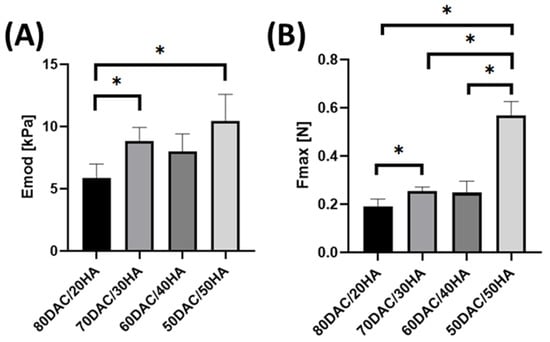Assessment of mechanical parameters answers the question of whether material modifications are effective. In Figure 3, compressive modulus and maximum compressive force were shown. Mechanical parameters depend on the material composition (Figure 3). Higher hyaluronic acid content resulted in the improvement of compressive modulus (Emod) and maximum compressive force (Fmax). The highest parameters were noticed for scaffolds composed of 50DAC/50HA.