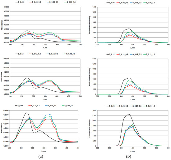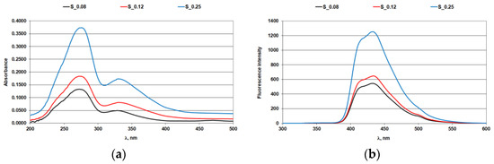 In Figure 1a,b, the absorbance and fluorescence spectra of stilbene OB are plotted for three different concentration ranges. The results obtained showed that increased concentration of optical brightener resulted in higher absorption of UV radiation (S-0.08 < S-0.12 < S-0.25), Figure 1a. The stilbene optical brightener exhibits two absorption peaks, one in the UV-A (at wavelength 330 nm) region and one in the UV-C (at wavelength 273 nm) region. The fluorescence maximum of stilbene OB is at 430 nm (Figure 1b).
