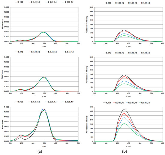 UV/Vis spectrophotometer Lambda 20, Perkin Elmer, was used under the following measurement conditions: range from 200 to 500 nm, aperture size 2 nm, and reading-off range 1 nm for absorption spectra of solutions. Fluorimeter F-7000, Hitachi (Tokyo, Japan), was used to measure fluorescence intensity in the wavelength range of 300 to 600 nm, at excitation wavelength of 250 nm, and wavelength scan speed of 240 nm/min.