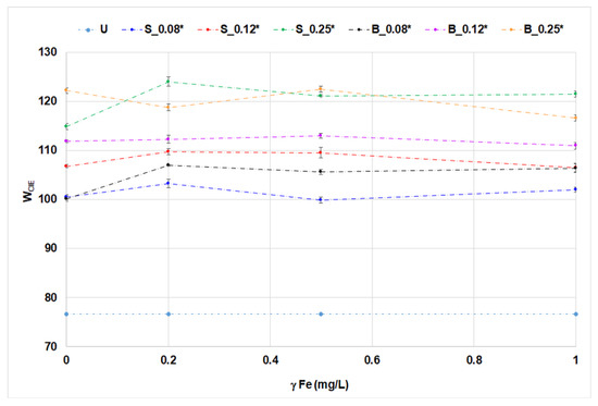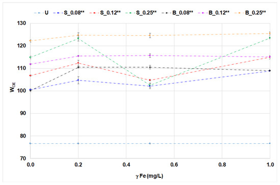 In the treatment of cotton fabrics, the influence of iron ions on optical effects and UV protection effects was additionally investigated. The values of whiteness degree for cotton fabrics treated with single-bath treatment can be seen in Figure 5 and Figure 6.