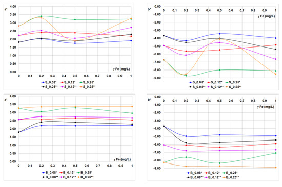 The effect of iron ions added to the fluorescent compounds on washed cotton fabrics was monitored using the CIEL*a*b* color space lightness in Table 6 and a*b* coordinates, Figure 7.