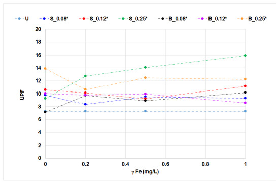 Untreated cotton fabrics exhibited a negligible degree of protection (UPF 7.276), mainly due to their structural properties and prebleaching processing level [7]. According to the influence of iron ions on stilbene OB in solution, expressed by the complex form, it was expected that the UPF of treated cotton fabrics would be increased. The UPF results of cotton fabric after single- and two-bath treatments were only slightly increased despite differences in absorption and fluorescence. The highest UV protection (UPF 15.923) was observed on cotton fabric after single-bath treatment with stilbene OB at 0.25% concentration with the highest concentration of iron ions (1.0 mg/L). Two-bath treatment, especially at 0.25% w/w, reduced the UPF, which may be attributed to the ion-exchange properties of cotton cellulose and its reaction with iron ions (Figure 8 and Figure 9).