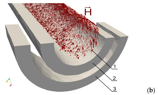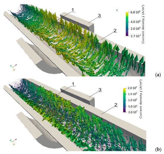 A cross-section view of the eddy current vectors along the shaft’s axis for different values of torque M: (a) M = 0 Nm, (b) torque M = 1.3 Nm; 1—shaft (transparent), 2—magnetizing coil, 3—sensing coil.