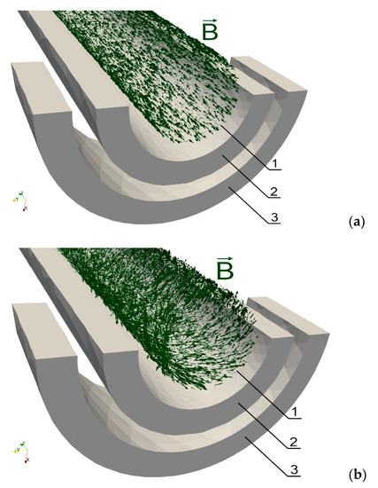 Magnetic flux density inside the shaft for different values of torque M: (a) M = 0 Nm, (b) torque M = 1.3 Nm; 1—shaft (transparent), 2—magnetizing coil, 3—sensing coil.