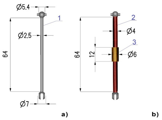 The experimental validation of the proposed model was performed on a 7250R drive shaft (Traxxas, McKinney, TX, USA) which is made of constructional steel. This type of shaft is generally used for electric vehicle models on a 1:16 scale. The geometry and dimensions of the shaft are shown in Figure 6a. For the purpose of this experiment, two coils were wound on the shaft: the magnetizing coil (where the length of the entire shaft is 150 turns) and a sensing coil of 50 turns. The coil arrangement diagram is presented in Figure 6b where numbers ‘1’, ‘2’, and ‘3’ denote the shaft, magnetizing coil, and sensing coil, respectively, and the given dimensions are in millimeters. One end of the shaft was anchored, and torque was applied to the other end by hanging weights on a lever arm.