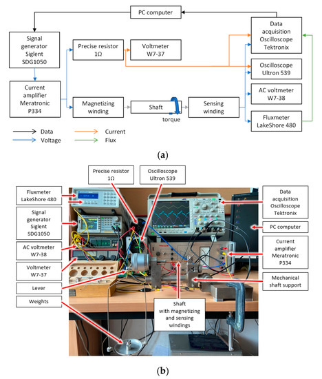 The measurement setup for testing the magnetoelastic torque sensing system: (a) schematic diagram, (b) photograph of the system.