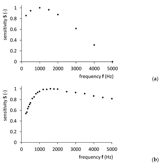 Figure 8 presents the experimental results obtained for the sensitivity value S(f) in comparison to the FEM modeling, while Table 1 provides detailed experimental results.