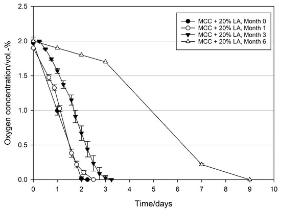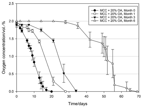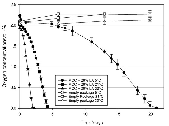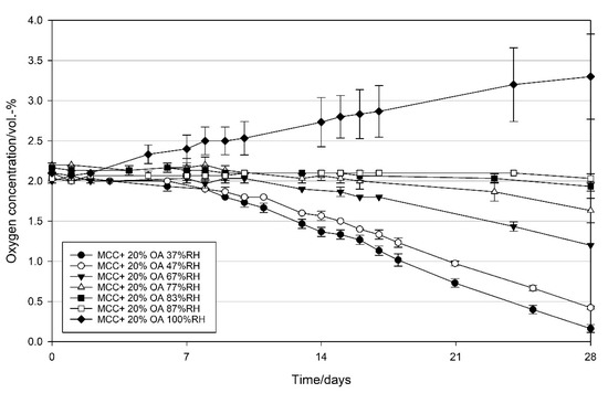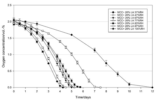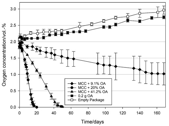 4.3. Effect of Relative Humidity on the Oxygen Scavenging Activity of MCC Loaded with UFAs