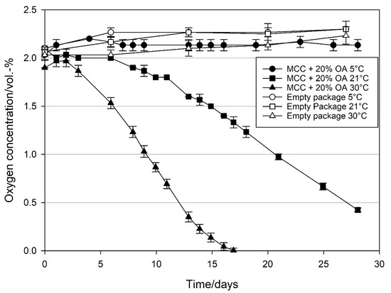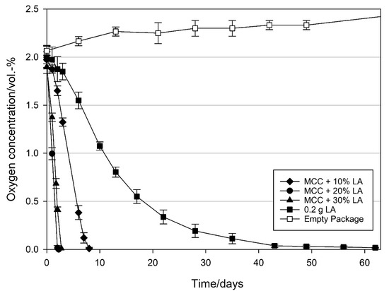 - Braga, L.R.; Sarantópoulos, C.I.G.L.; Peres, L.; Braga, J.W.B. Evaluation of absorption kinetics of oxygen scavenger sachets using response surface methodology. Packag. Technol. Sci. 2010, 23, 351–361. [Google Scholar] [CrossRef]