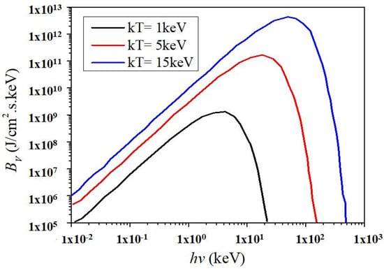 Powerful pulsed X-ray is radiated outward as an expanding X-ray fireball, which can be approximated as a blackbody [,,]. Therefore, the X-ray energy spectrum is approximated as the blackbody radiation spectrum. Blackbody spectrum X-ray refers to the energy radiated outward in the form of electromagnetic waves by high-temperature objects. The X-ray energy and the proportion of photon component vary with the temperature of the objects. The radiation intensity is computed by Planck formula.
