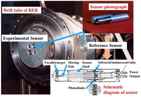 Figure 2 shows the photo and schematic structure of the blow-off impulse probe. The parallel target is attached to one end of the signaling rod whose other end is shaped into several evenly spaced rings. Moreover, infrared luminous diodes and photoelectric triodes are installed on both sides of the rod. When the blow-off impulse produced by electron radiation pushes the target and the transmitting bar, the rings block off the light and cut off the signal; after that, the signal is restored. The digital oscilloscope records the time interval “Δt” while the rod moves through the spacing L between two rings (L = 5 mm). Thus, the average velocity of the rod is obtained:
