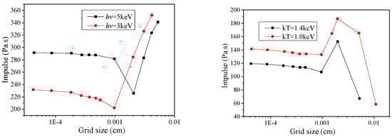X-ray energy decays exponentially in the material when irradiating the target. X-ray energy is primarily deposited as a thin layer on the surface of a material []. Besides, the X-ray energy deposition profile varies rapidly with the depth of the thin layer. Accordingly, different mesh sizes significantly impact the distribution of the X-ray energy deposition, which critically determines blow-off impulse calculation. The numerical results of blow-off impulse are largely determined by grid size, so the irrelevant grid should be developed, and the grid-independent solution should be obtained.