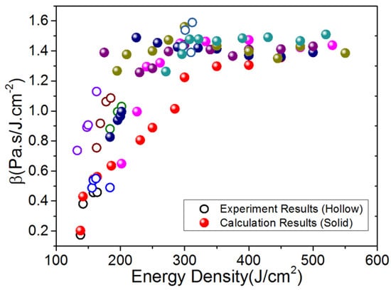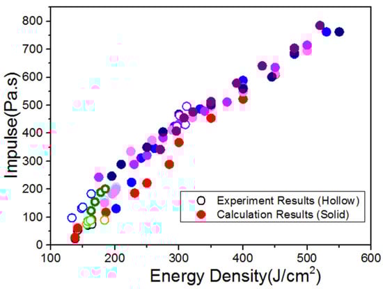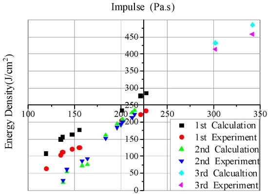 Figure 10 shows the calculation results of blow-off impulse by experimental expansion, under the electron beam irradiation blow-off impulse with energy flux ranging 100–500 J/cm2, with maintained system information of electron beam. The numerical calculation results are equivalent to the experimental ones to a certain extent. The blow-off impulse increases linearly with the change in energy flux. Figure 11 shows the calculation results and impulse coupling coefficients under different energy fluxes. The impulse coupling coefficient is consistent, according to the comparison between the experimental results and the calculated results in the same energy.