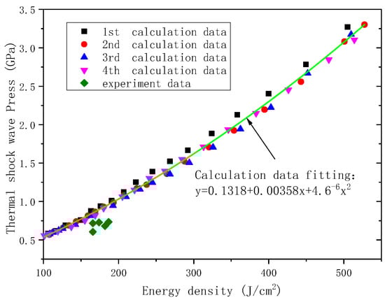 Figure 12 shows the calculation results and experimental data of thermal shockwave stress under different energy fluxes. The former, albeit slightly larger, is in good agreement with the latter to a certain extent, with consideration of the uncertain energy flux and thermal shock wave stress. It shows the influence of uncertain electron beam system on the thermal shock wave stress, because of the linear increase in thermal shock stress with the change of the energy flux, and the small dispersion.