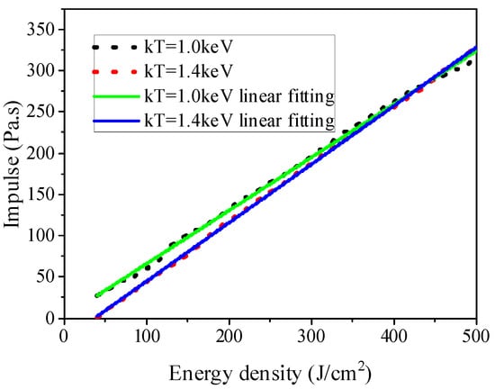 The same aluminum alloy materials were selected as the target materials in the experiment. The blackbody spectra were 1 keV and 1.4 keV, and the X-ray time spectrum used a rectangular pulse of 0.1 s in width. The variation of blow-off impulses with X-ray energy flux was calculated for X-ray spectrum, with its energy flux ranging 50–500 J/cm2. The calculation results of the blow-off impulse are shown in Figure 14, with the black and red lines representing the blow-off impulse of 1 keV and 1.4 keV blackbody spectrum X-rays, respectively. It can be seen from the graph that there is a different monotonous increase in blow-off impulse with the energy flux. The approximate fitting formulas are as follows: