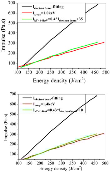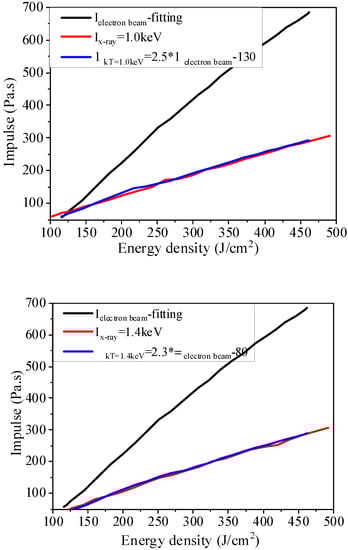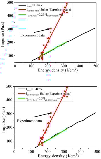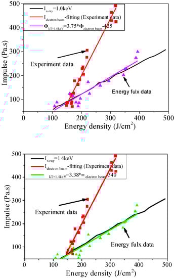 This formula provides the numerical relations between the irradiation blow-off impulse of the electron beam and the blackbody spectrum X-ray under the same energy flux, which is called equivalent energy flux relations. Figure 15 shows the comparison between the numerical calculation results and the blackbody spectrum X-ray’s irradiation blow-off impulse converted from that of the electron beam under identical energy flux relations. It can be seen intuitively that they are in good agreement.