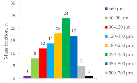 For the investigations, zirconium powder was used with the chemical composition shown in Table 1 and fractional composition of the powder particles shown in Figure 1. Zirconium powder was obtained by the electrolysis of molten zirconium salts [2,3].