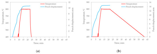 The sintering curves are presented in Figure 3. The main difference between the two sintering regimes is the cooling rate—rapid at 400 °C/min and slow at 10 °C/min, presented in Figure 3a,b, respectively. What is clearly seen from the punch displacement curves is that the 10 min holding time allows compacts with nearly full density to be obtained, having a relative density of 98.31% and 98.92% for the rapid and slow cooling, respectively. The plateau of both curves is clearly seen during the holding stage; however, at the end of sintering, a slight punch movement was observed, which means that further consolidation (residual porosity elimination) occurred.