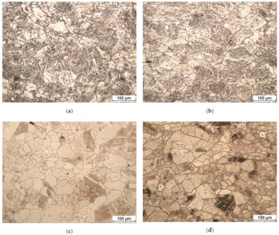 Microstructure of zirconium spark plasma sintered at 800 °C with various cooling rates and subsequent heat treatment at: (a) 400 °C/min; (b) 10 °C/min; (c) 400 °C/min + heat treatment at 580 °C and holding at 120 min; (d) 400 °C/min + heat treatment at 750 °C and holding time at 30 min.