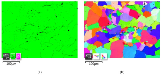 EBSD micrographs of zirconium spark plasma sintered at 800 °C and subsequent heat treatment at 580 °C with holding at 120 min: (a) phase map; (b) IPF map.