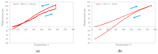 From Figure 7b, it can be concluded that with an increase in the heating temperature from 580 to 750 °C, the expansion of the metal continues to ≈100 µm, but when entering the annealing, no significant changes are observed on the dilatometric curve. It is most likely that significant changes in the microstructure began at a lower temperature of ≈500 °C; a change in the linear expansion coefficient (1) is noted on the curve.