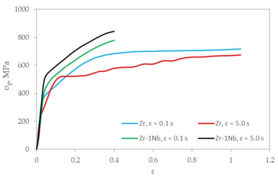 From the comparison of the flow curves of the investigated specimens obtained using the new (Zr) and traditional (Zr-1Nb) manufacturing routes, it was revealed that the flow curves for the specimens manufactured using the new route are slightly lower than the curves for the specimens obtained using the traditional technology (Figure 8), which is due to the difference in chemical composition. The samples obtained using traditional technology have a niobium addition (≈1 wt %). Niobium is an alloying element introduced into the chemical composition of ingots to stabilize the corrosion resistance of unalloyed zirconium (it eliminates the harmful effect of small amounts of carbon, aluminum, and titanium impurities) and improves the mechanical properties. Niobium effectively reduces the fraction of hydrogen absorbed by zirconium alloys [2].