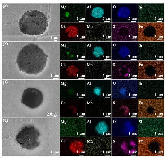 At least 50 inclusions randomly selected on the steel surface were observed by microscopy in order to obtain statistically relevant results. Based on the composition measured by EDS, the inclusions were classified into four different types, namely, Mg−Al−Si−O−Ca−S (Figure 2a), Mg−Al−O−Ca−S (Figure 2b), Mg−Al−O−Ca−Mn−S (Figure 2c), and Al−O−Ca−S (Figure 2d). Of the 50 inclusions, these 4 types of inclusions represented 58%, 30%, 10%, and 2% of the total number, respectively.