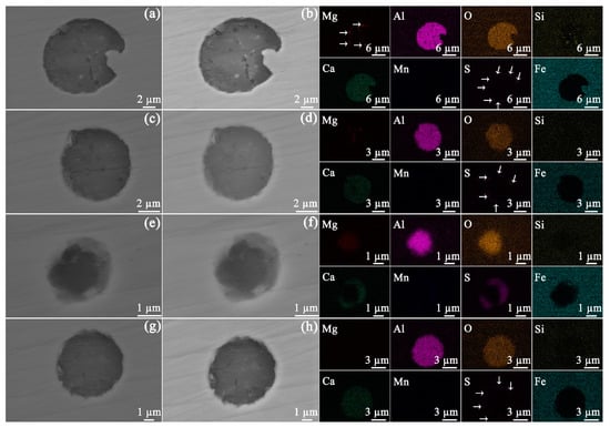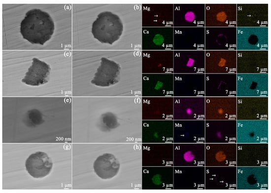SEM SE images of the inclusion containing Mg−Al−Si−O−Ca−S before (a) and after (b) exposed to bitumen at 120 °C, of the inclusion containing Mg−Al−O−Ca−S before (c) and after (d) exposed to bitumen at 120 °C, of the inclusion containing Mg−Al−O−Ca−Mn−S before (e) and after (f) exposed to bitumen at 120 °C, and of the inclusion containing Al−O−Ca−S before (g) and after (h) exposed to bitumen at 120 °C. The elemental distributions of the inclusions are given at right. In the EDS maps given at right, the areas with low signal intensity are marked with arrows.