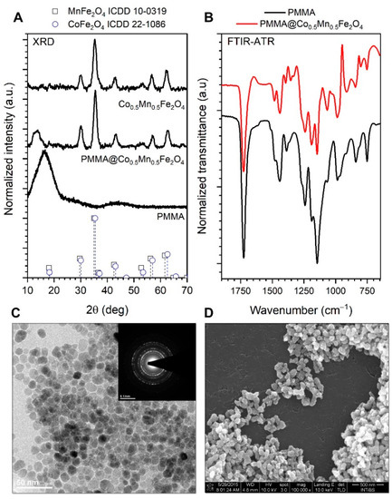 X-ray diffraction patterns of the Co0.5Mn0.5Fe2O4 and Co0.5Mn0.5Fe2O4@PMMA (A,B) FTIR-ATR spectra of the reference PMMA and composite sample; (C) TEM and SAED images of the Co0.5Mn0.5Fe2O4 nanoparticles, as well as (D) SEM picture of the binary hybrid.