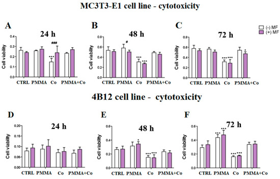 The kinetics of anti-proliferative effects of PMMA and PMMA@Co0.5Mn0.5Fe2O4 towards mouse pre-osteoblasts (MC3T3-E1 cell line) after 24 h (A), 48 h (B) and 72 h (C) and towards mouse pre-osteoclasts (4B12 cell line) after 24 h (D), 48 h (E) and 72 h (F) in the presence of the magnetic field. Notes: CTRL—control, PMMA—poly(methyl (methylacrylate), Co—Co0.5Mn0.5Fe2O4, PMMA + Co—Co0.5Mn0.5Fe2O4@PMMA in ratio 80/20, MF—magnetic field. Statistical differences are indicated by * p < 0.005 and *** p < 0.0001 (in comparison to control) and by # p < 0.005; ### p < 0.0001 (comparison MF+/MF−).