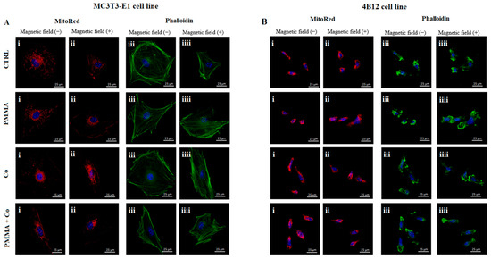 The impact of the PMMA and its modification on the mitochondria status and cytoskeleton in the MC3T3-E1 (A) and 4B12 (B) cell line in the presence of the magnetic field. Notes: CTRL—control, PMMA—poly(methyl (methylacrylate)), Co—Co0.5Mn0.5Fe2O4, PMMA+ Co—Co0.5Mn0.5Fe2O4@PMMA in ratio 80/20.