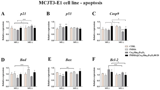 The impact of the PMMA and its modification on the apoptosis of pre-osteoblasts and pre-osteoclasts was determined using qPCR. The expression of p21, p53, Casp9, Bad, Bax and Bcl-2 was analyzed after 24 h of incubation of the cells with the addition of PMMA and Co0.5Mn0.5Fe2O4@PMMA in ratio 80/20 in the MF condition.
