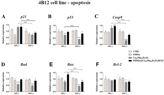 In turn, the expression of the p53 gene after 24 h exposition to Co0.5Mn0.5Fe2O4@PMMA was increased in the MF(−) condition, compared to control (Figure 5B). In parallel, the expression of the Casp9 and Bcl-2 were increased after PMMA@Co0.5Mn0.5Fe2O4 incubation in the MF(−), in comparison to MF(+) (Figure 5C,F).