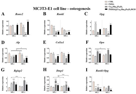 The impact of PMMA and its modification on the expression of genes related to osteogenesis: Runx2 (A), Rankl (B), Opg (C), Alp (D), Col1A1 (E), Opn (F), Bglap2 (G), Dmp1 (H), Rankl:Opg (I) in the magnetic field condition towards mouse pre-osteoblasts (MC3T3-E1 cell line).Statistical differences are indicated by * p < 0.005; ** p < 0.001 and *** p < 0.0001.