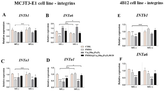 In turn, the combination of the PMMA and Co0.5Mn0.5Fe2O4@PMMA decreased the expression of the INTa1 in the MF(−) condition as well as INTa3 in the MF(+) condition in pre-osteoblasts (Figure 9C,D). Additionally, the impact of the magnetic field on the expression of INTa6 and INTa3 after this combination was reported, although in case of the INTa6 the expression was decreased in the MF(+) condition as compared to MF(−), while in case of the INTa3, it was increased in the MF(+) condition (Figure 9B,D).