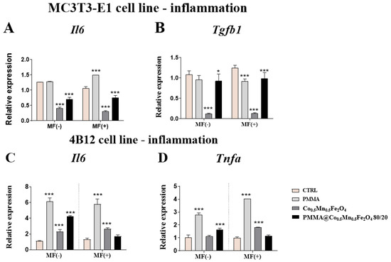 Interestingly, the results associated with the inflammation profile showed that the new modification of PMMA could decrease the expression of Il-6 independently of the presence of magnetic field in the pre-osteoblasts, while increasing in the pre-osteoclasts (Figure 10A,C). The opposite, also independently of the presence of MF, Co0.5Mn0.5Fe2O4 @PMMA in a ratio of 80/20 caused the decrease of the Tgfb in MC3T3-E1 cell line and enhanced the expression of Tnfa (Figure 10B,D).