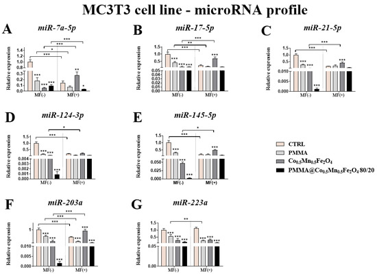 The impact of PMMA and its modification on the microRNA profile associated with osteoblastogenesis and osteoclastogenesis expression of miR-7a-5p (A), miR-17-5p (B), miR-21-5p (C), miR-124-3p (D), miR-145-5p (E), miR-203a (F) and miR-223a (G) in the magnetic field condition towards mouse pre-osteoblasts (MC3T3-E1 cell line. Statistical differences are indicated by * p < 0.005; ** p < 0.001 and *** p < 0.0001.