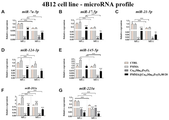 The impact of PMMA and its modification on the microRNA profile associated with osteoblastogenesis and osteoclastogenesis expression of miR-7a-5p (A), miR-17-5p (B), miR-21-5p (C), miR-124-3p (D), miR-145-5p (E), miR-203a (F) and miR-223a (G) in the magnetic field condition towards mouse pre-osteoclasts (4B12 cell line). Statistical differences are indicated by * p < 0.005; ** p < 0.001 and *** p < 0.0001.