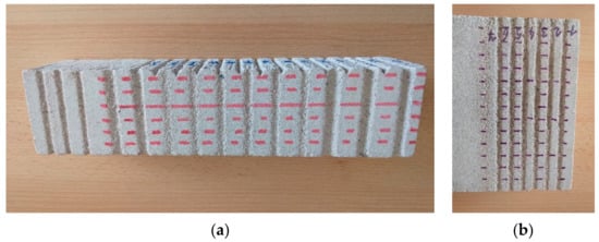 Figure 1a, the vertical wall). The whole cut (140 mm) was measured with a digital caliper PWA (Bernardo, Linz, Austria); the depth was measured for each cm of the grove (the marks on measured points are visible in