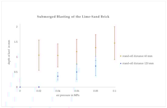 Figure 6 shows the air overpressure dependence of the average kerf depth during submerged blasting. Based on the evaluation of the in-air experiments and theoretical analysis, we used lower air inlet pressures, which, as we assumed, do not lead to destabilization of the water jet. The results indicate that without a protective coaxial air stream, the water jet is quickly attenuated and it has almost no effect on the investigated material (