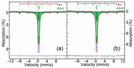 The Mössbauer spectra of the ZPR sample obtained at 296 K (a) and 78 K (b).