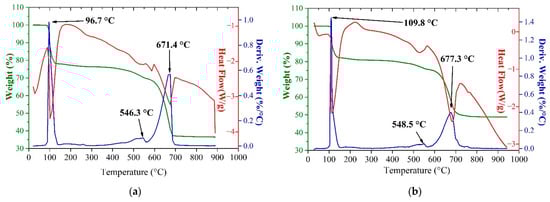 TG-DSC thermogram of pure FeSO4∙7H2O (a) and ZnFe2O4 + FeSO4∙7H2O mixture in 1:4 molar ratio excluding hydrated moisture (b).