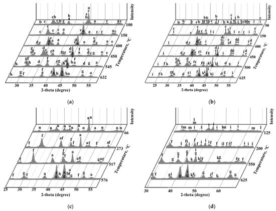The XRD patterns obtained at different temperatures during TRXRD experiments using mixtures of 18.2% ZnFe2O4 + 81.8% FeSO4∙7H2O (a), 18.1% CuFe2O4 + 81.9% FeSO4∙7H2O (b), 17.2% ZnFe2O4 + 82.8% FeSO4∙7H2O (c) and 17.1% CuFe2O4 + 82.9% FeSO4∙7H2O (d), where a—ZnFe2O4; b—FeSO4∙4H2O; c—FeSO4∙H2O; d—FeSO4; e—Fe(OH)SO4; f—Fe2(SO4)3; g—Fe2O3; h—ZnSO4; i—CuFe2O4; k—CuSO4; l—Fe2(SO4)3∙5H2O; m—Fe2(SO4)3∙7H2O; n—Fe2(SO4)3∙9H2O.