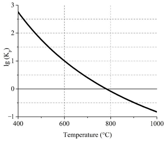 The equilibrium curve evidences that forward reaction (6) of SO3(g) formation is possible at temperatures up to 780 °C. The logarithm of the equilibrium constant of the reaction at 680 °C and lower have a value above 0.5 with a significant proportion of SO3(g). This fact explains the obtaining of inconsiderable sulfation degrees of pure ferrites at 700 °C (Section 3.2.2). However, it should be noted that at 550 °C there was also an unessential sulfation degree that is probably due to an insignificant decomposition rate of iron sulfate at such conditions according to the reaction (3).