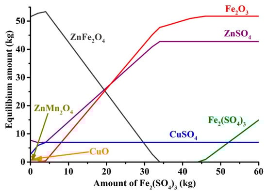 To determine the required amount of iron (III) sulfate for zinc and copper sulfation, the thermodynamic simulation was carried out. Figure 7 points out an influence of the addition of anhydrous iron (III) sulfate on equilibrium amounts of zinc, copper and iron compounds in ZPR at the roasting conditions.