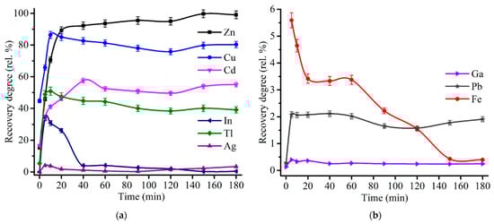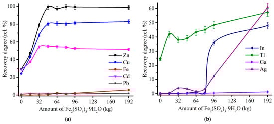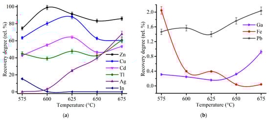 Effect of the roasting temperature on the recovery degree of Zn, Cu, Cd, In, Tl, Ag (a), as well as Ga, Fe and Pb (b) after 180 min of the roasting and subsequent water leaching with the addition of 48% Fe2(SO4)3·9H2O to 100% ZPR.