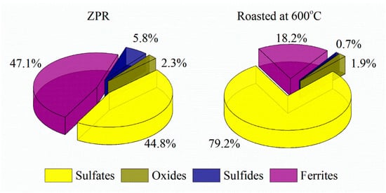 The recovery rate of zinc reaches 99% at 600 °C and then gradually decreases with the temperature increase. Therefore, it can be stated clearly that sulfating of zinc minerals in ZPR, namely, zinc ferrite, zinc oxide, zinc sulfide and zinc silicate, are possible almost completely according to the reaction (4), as well as the following reactions [42]: