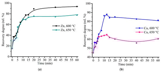 As is clear from the pie chart, a significant part of Cu remains in the roasted sample as a ferrite. Probably, sulfating of copper phases is similar to zinc, but despite the thermodynamic possibility, reaction (5) has a hindrance during the roasting at these conditions. The experiments have shown (Figure 8) that although the roasting at 625 °C leads to increasing of copper recovery degree compared with 600 °C, the sulfating degree of copper ferrite are still less fully than the sulfating degree of zinc ferrite. However, the obtained copper recovery degrees of about 80% is quite satisfactory taking into account the extraction of 99% Zn.